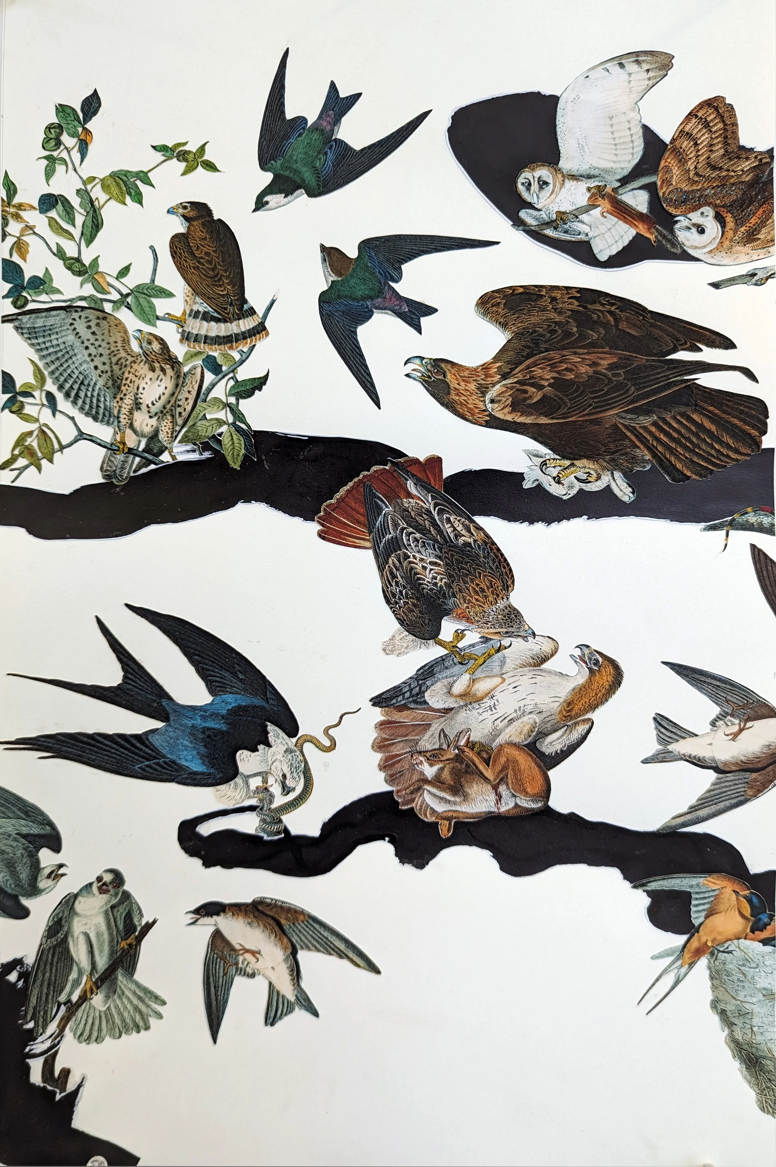 In this series I have combined my meditative ink line-shapes with edited prints of (mostly) birds of prey from Audubon’s nineteenth century catalog of American birds. The birds squabble or devour their prey sitting on or between the black ink elements, oblivious to them. You could take the view that either element could be an infestation of the other, but given human tendencies, the birds are the more likely culprits.